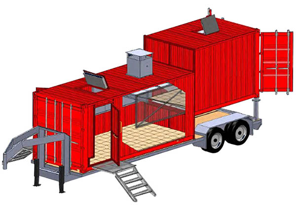 The Mobile Flashover Simulator is fabricated from (1) 40’container. A 10’ fully insulated burn module is continuously welded to a 20’ student observation module and attached to a DOT compliant trailer. The simulator has been specifically designed for observation and recognition of fire behavior (from rollover to flashover) by varying fuel load and altering ventilation.